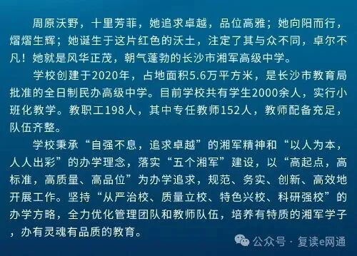 长沙市湘军高级中学是长沙市教育局主管的全日制民办普通高级中学。学校创建于2020年,地处长沙市空港新城。目前在校学生1910名,专职教师168名,其中高级教师55人,硕士及以上学历教师占比77%。