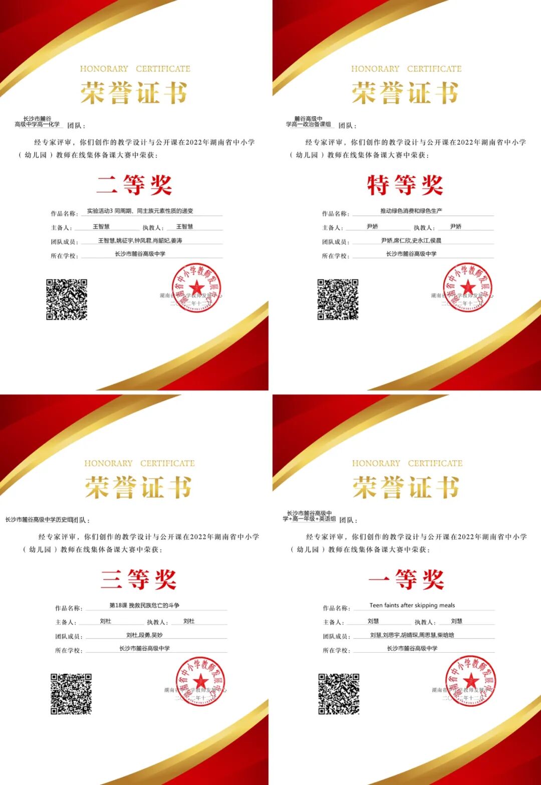 目前,我校拥有100余名在职正高级教师、特级教师、清北班名师、省市教研员、学科带头人、高三关键教师等。他们技艺精湛、师德高尚、经验丰富。学校实行年级负责制,各年级、备课组各尽其责、发挥其才。根据学生年级情况,每天开设两堂“勤学好问”培优辅导课,每周举办名师讲座。不断优化教学内容和课程设计,关心关爱学生,深受学生和家长一致好评。在2023年,我校教师在各级各类比赛中斩获优异成绩,共获得各级赛课荣誉59人次,其中省级赛课荣誉及称号27人次,获得各级论文评比荣誉61人次。在长沙市,已经形成了有赛课就有麓谷高中,有麓高就有一等奖的盛况。