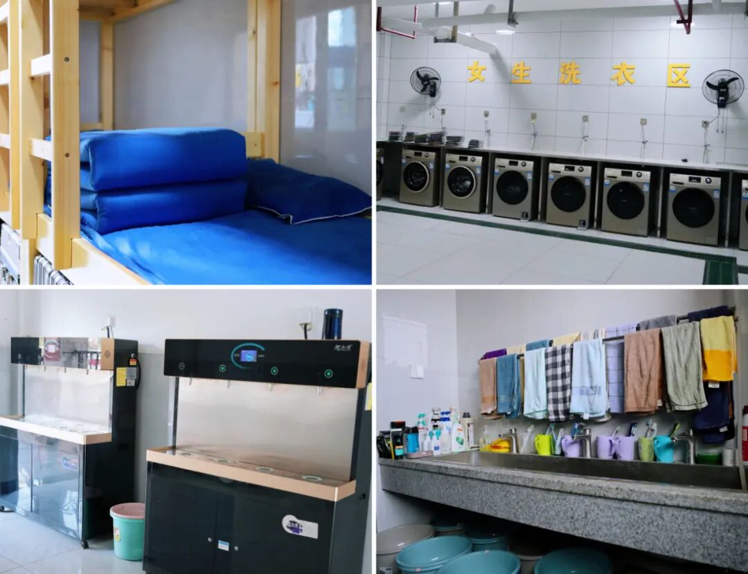 学生宿舍配备空调、独立充足的卫生间、浴室、洗手台,每位学生配备一个储物柜、衣柜、鞋柜。每间宿舍为学生提供洗澡的热水,每层提供直饮水、自助干发吹风筒,建有标准的自助洗衣房。