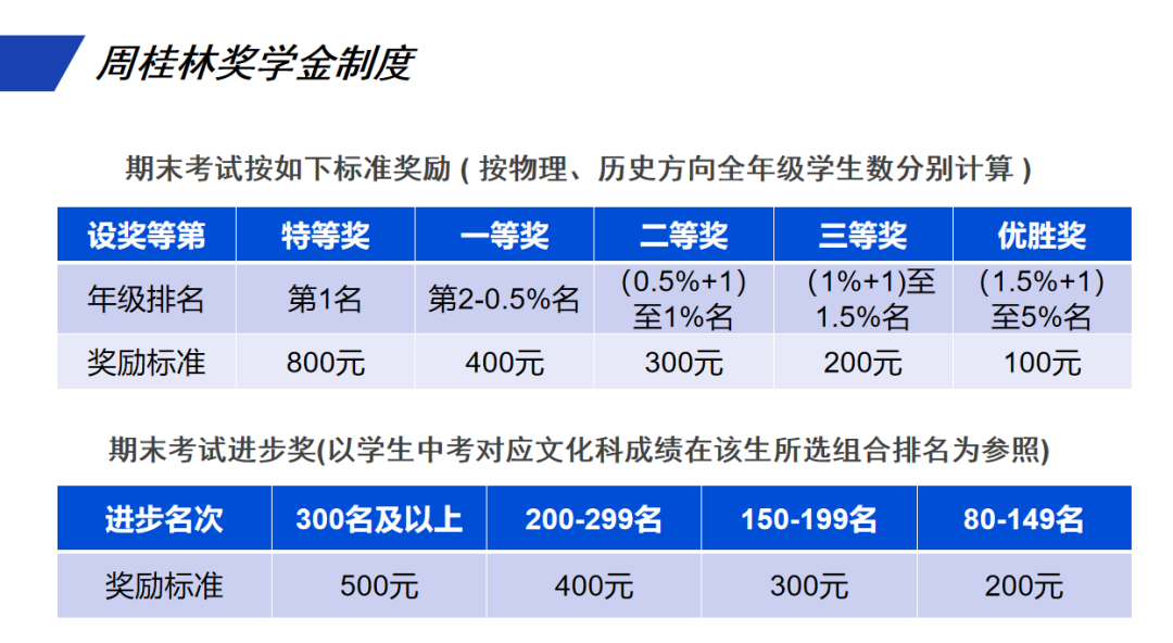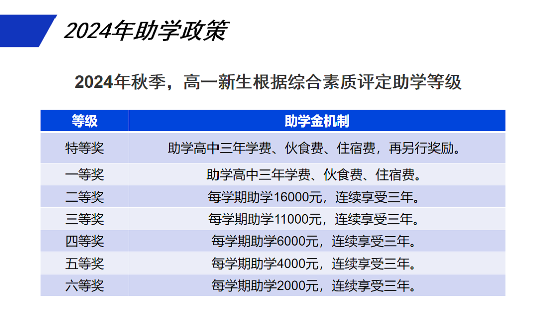 学校实行新生助学和每学期学业成绩优异奖学金制度,以奖励表现优秀的高一新生、高考复读生以及在品德学业上表现出色的学生。