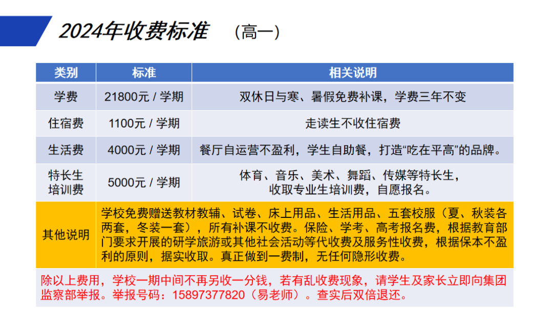 学校承诺严格执行长沙市物价局对学校制定的各项收费标准,严格遵守相关规定,不乱收费、乱涨费,自觉接受社会各界监督。